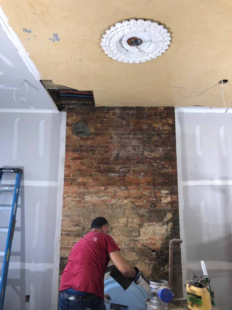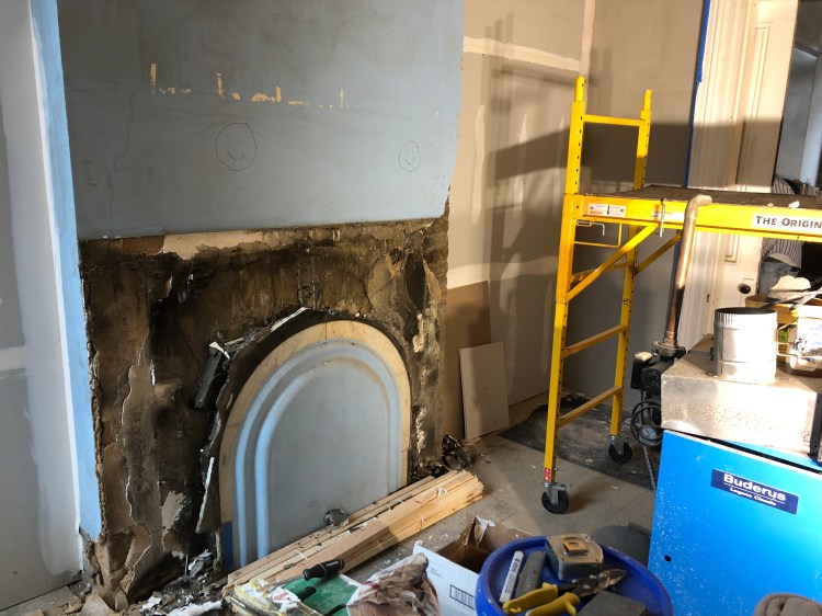 Inside, New finishing team has been busy all week, and are making fantastic progress. We also removed the fireplace mantle in the dining room for repairs.