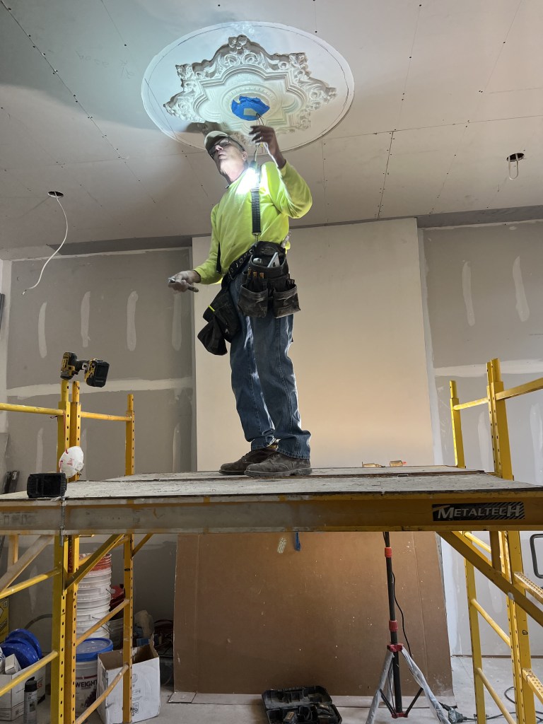 - Mantle was reinstalled in the dining room. The team also put new drywall across the ceilings in the LR and DR, rather than reskim the entire ceiling. Mud and tape is complete. Only thing left is to skim the common wall in the stairwell.