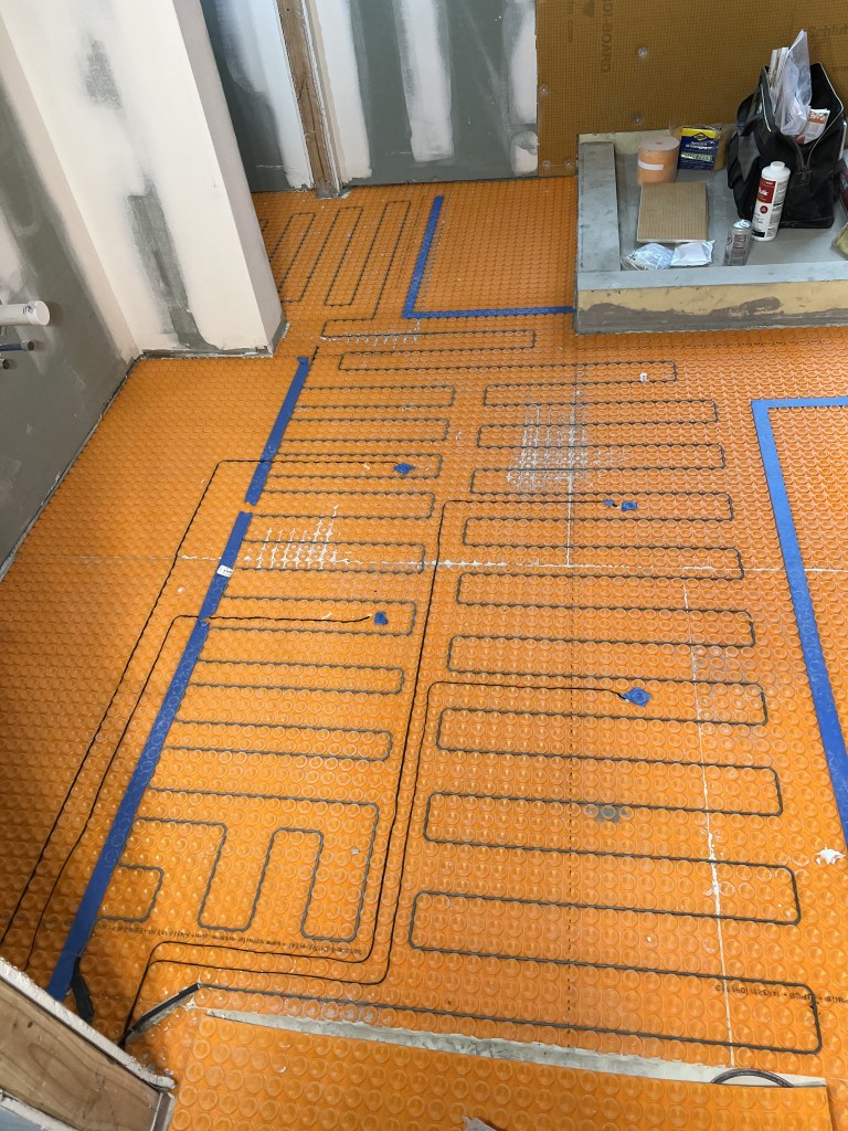 - Ditra-Heat install in master bathroom is complete, and tile has been installed over top. We went with a 2″ carrara marble hex tile. Since it was only available in sheets of all white, we (read: Mom) cut out one tile form each sheet so we could lay in one black tile every 12″. Results look good so far. Only work remaining is to apply grout, which should happen after thanksgiving.