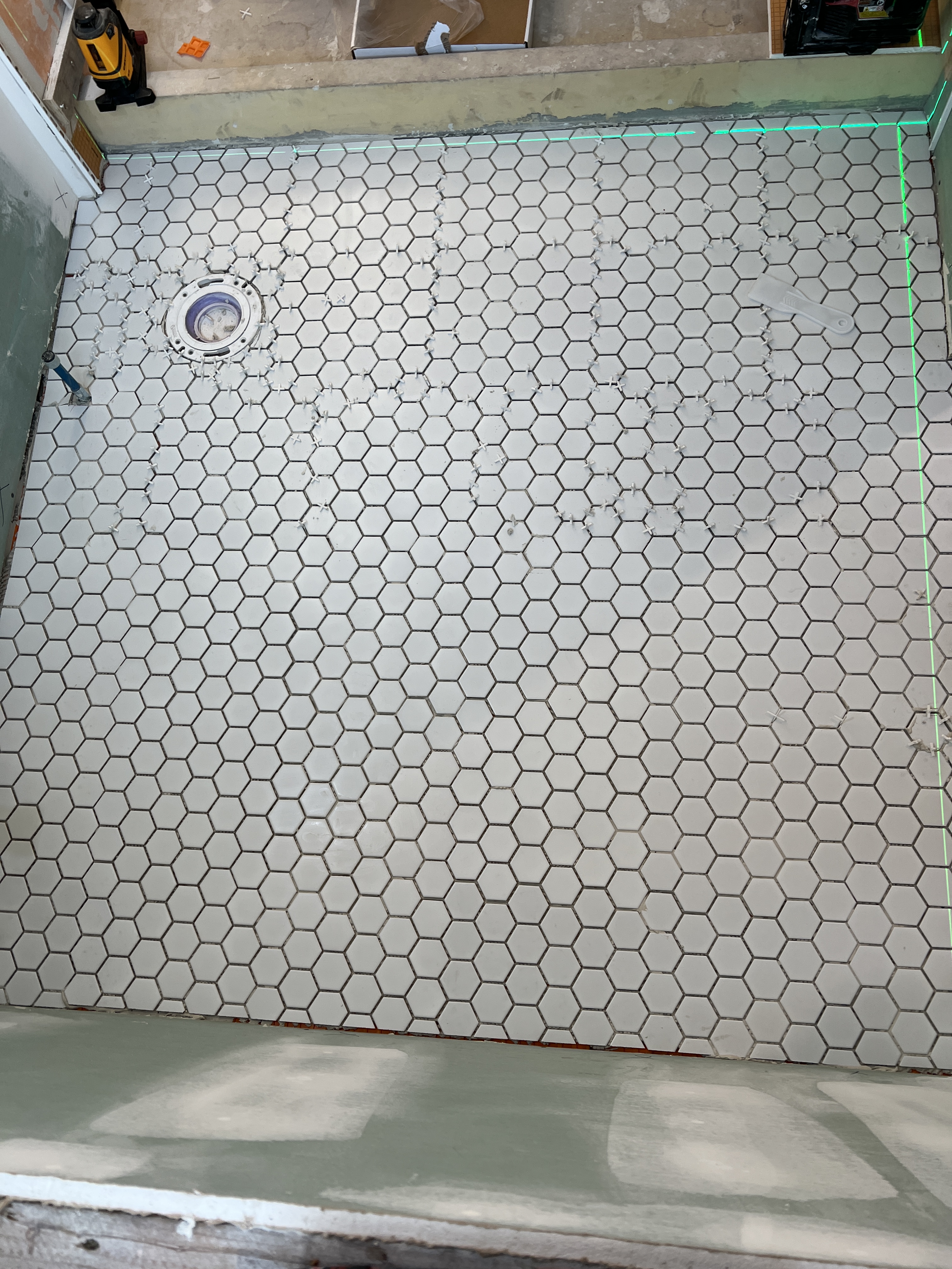 - Tile work on the second floor bathroom is on hold. I screwed up cutting the Schluter piece, and the new one doesn’t come in until this week, so the shower is “on hold”. We did lay down the floor, so we made “some” progress.