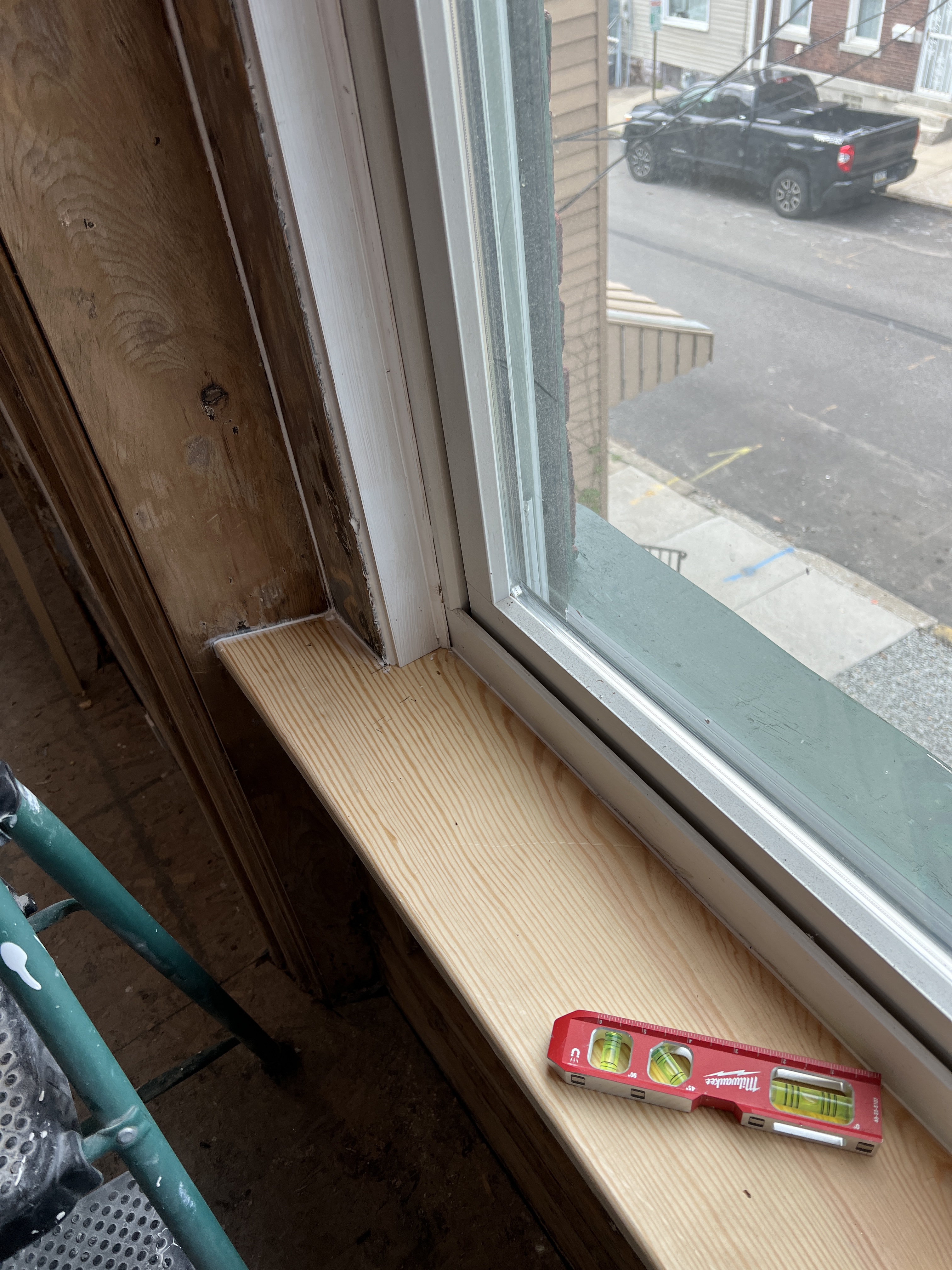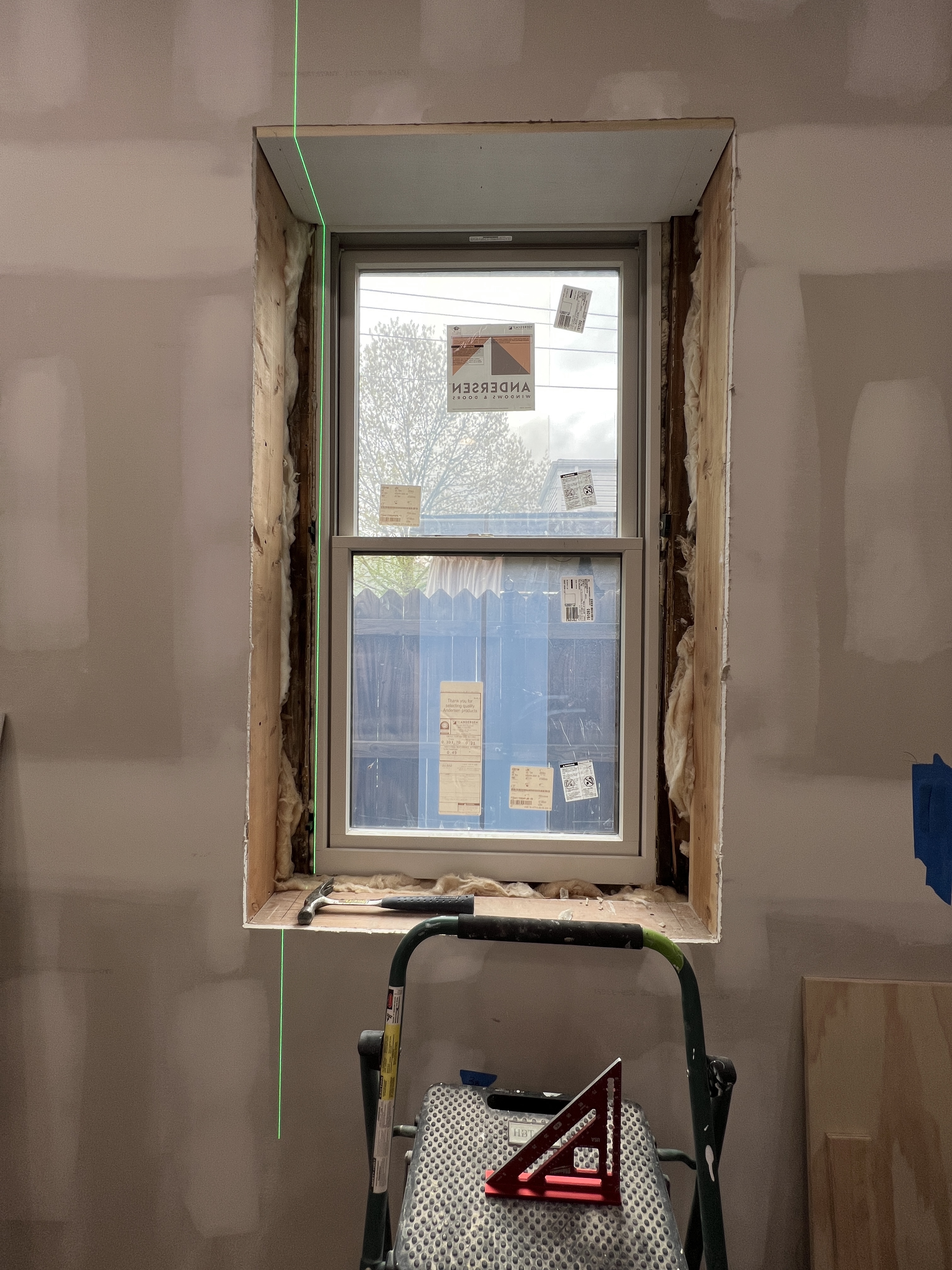 - Started trim work in the kitchen. One of the windows is substantially out of plumb (about 3/4″. which is a LOT). I’m trying to figure out whether I mask it with clever trim tricks, or actually re-open the installation and square up the window. In the image here, follow the green laser line to see the issue.