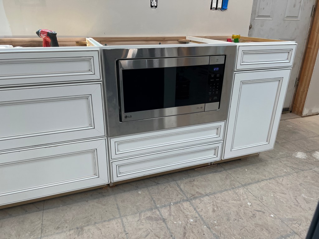 - Installed microwave. Had to customize the trim kit, as it assomes more open space above the microwave than we actually have. May add a small thermostatically controlled fan to the cabinet just to improve ventilation. Trim kit also needs slight adjustment.