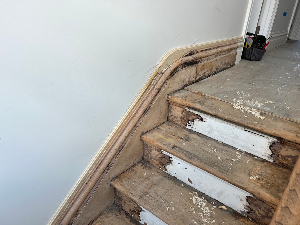 They did not take measurements/ template for the remaining pieces, but that’s not a big deal since they will have to template for the remaining cabinet, and they can do the other pieces at the same time. - I spent an entire day working on the third floor baseboard by the stairs. There was a significant gap behind the baseboard. This was because we pulled down the original plaster, which was ~1-1/4″ thick, and replaced it with wallboard (1/2″ thick). I milled up custom pieces to slide behind the baseboard, and it looks reasonable. There’s still one more piece of cap rail to make and fit in, but that is going to require some more sophisticated millwork.