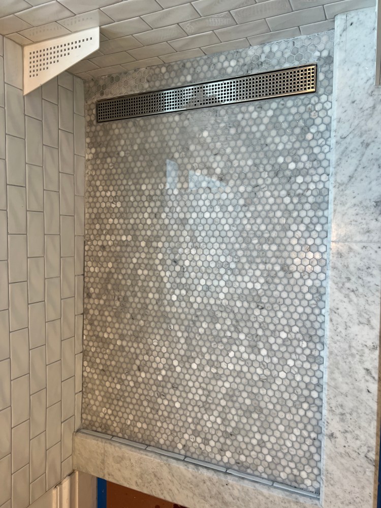 - We re-installed the tile in the master shower. As noted previously, the pan was not draining correctly. We applied a completely new layer of tile on top of the previous layer of tile. It seems to have worked quite well. The shower has been caulked and is ready for final plumbing installation and glass work.