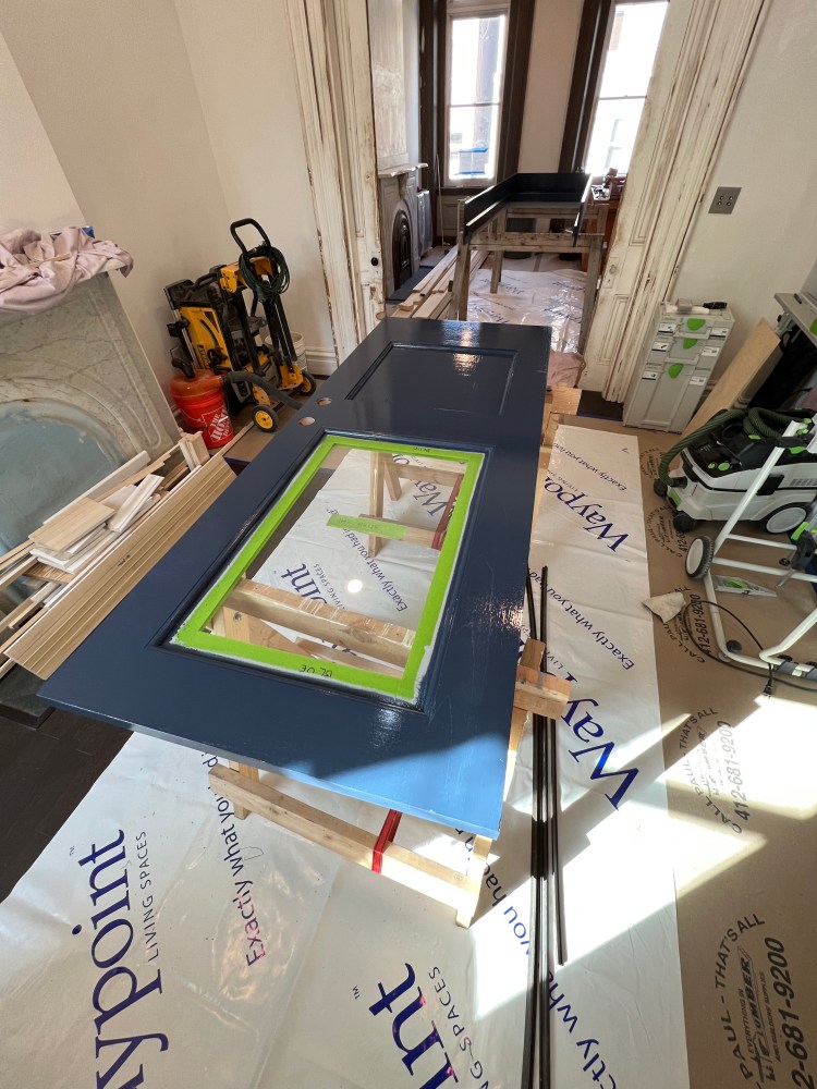 • Before I left for California, I sanded, primed, and painted the new back door by Allied Millworks. It is made of Spanish Cedar, and looks gorgeous. We painted it a deep blue, to match the island cabinets. It’s the first time I’ve worked with oil-based paint. While I’m not crazy about the fumes/ paint thinner, the results are well worth it. The finish seems very durable and has a beautiful deep lustre.