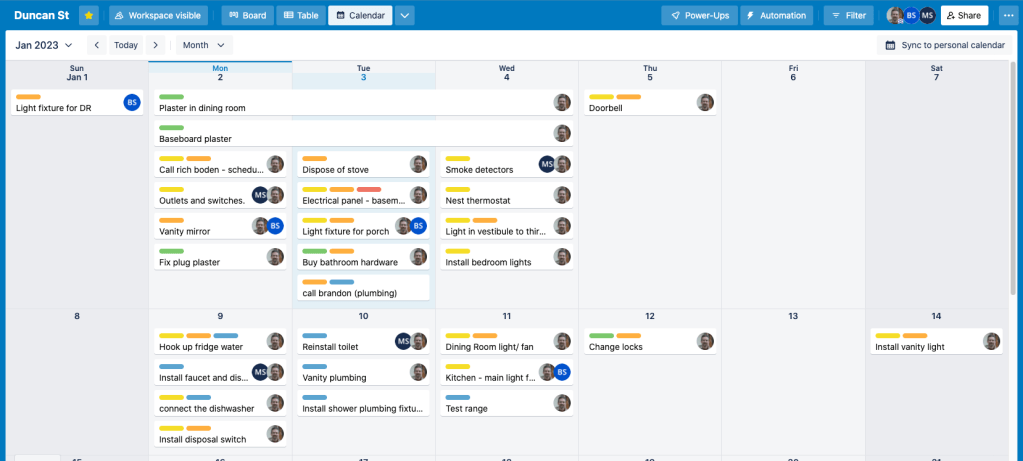 Starting the major push at Duncan St. I’ve moved the essential tools in, and have installed flooring protection. Below is a screen shot of my workplan.