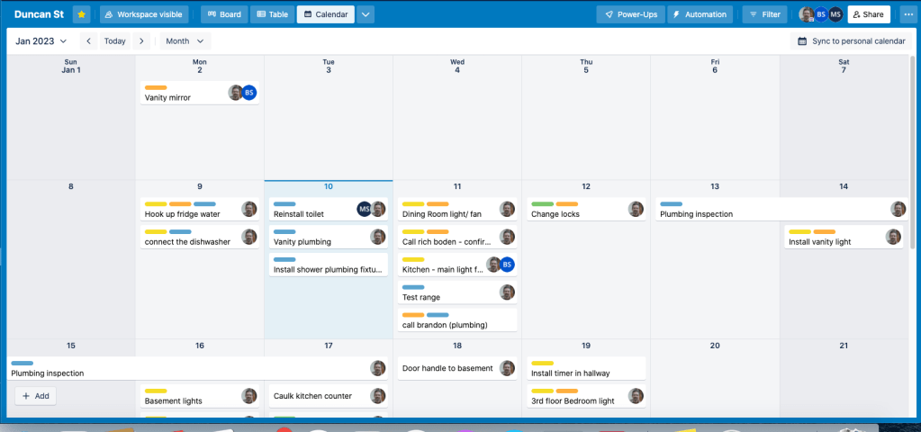 The completed tasks drop off the calendar as I close them out and archive the card. So the only thing left from last week is the vanity mirror. (I’m working with the glass guys from Mintwood to get that cut to fit).
