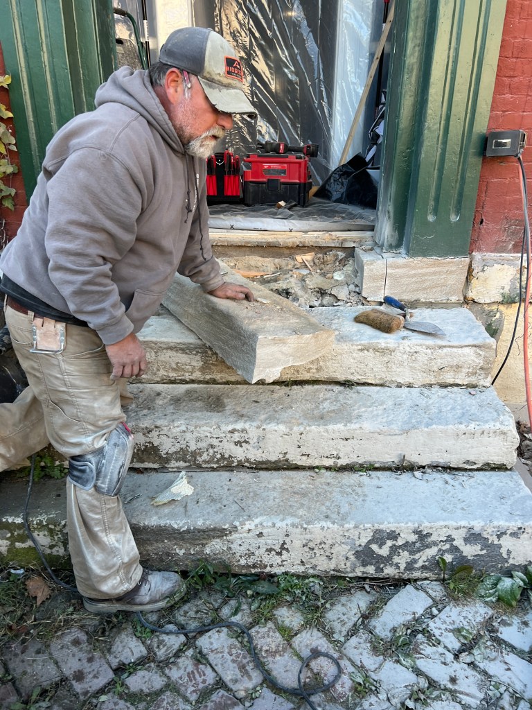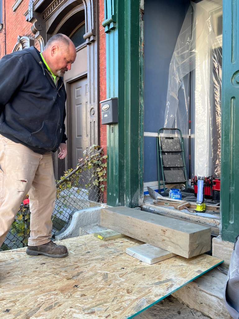 Inside, the first thing to do is put up drywall. The front wall of the house is made up of several wythes of brick. The door is installed in the rough opening, but I had to pull most of the plaster off that front wall in order to install the door. So now, we have to put that plaster back up, and then trim around the door. In parallel with that, I’ll float up the other walls in the vestibule so that they are nice and smooth. Kath wats to install wall paper, and that would look terrible over the walls we have currently, but it’ll get sorted out. Then there’s the trim- the front door has an arched transom, so that’s going to be a custom piece I’m going to have to make. door is installed in the brick (exterior) wall over the brick wall around the front door. Finally, I need to finish rehabilitating the interior vestibule door. That’s a couple of days in the shop, but it’s classic woodworking, which I’m going to enjoy. - We had a big “shop day” at Hack to rearrange the tools, and we staretd installing the custom wall cabinets for the miter saw station. There are a few things to sort out with the board before we finish that work, so I’ll focus on the house in the meantime.