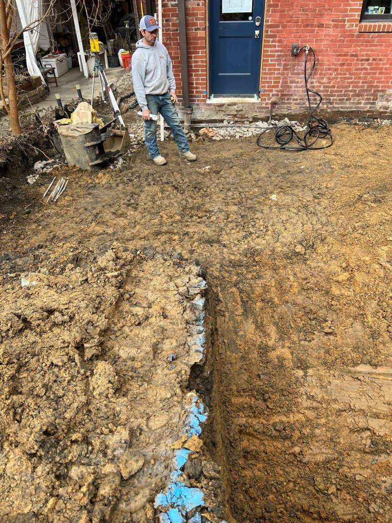 - I continue to be impressed with the accuracy of the equipment operators. In the photo below, we’d marked out with blue paint where the edge of the wall goes. Note that he split the line. That’s a heck of a thing to do with a 12,000 lb excavator and a boom that reaches 20′ from the cab. They also gently pulled soil away from the foundation of the neighboring building without disturbing the downpipe and the stone foundation. Looking at the photos, one might be forgiven for imagining that we did some hand digging, but there really wasn’t any.