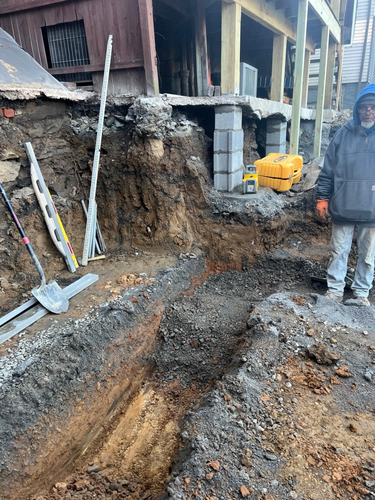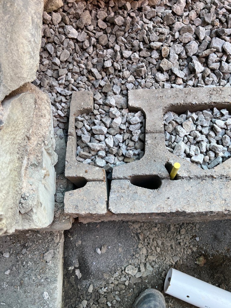 - Some days we are rocketing forward, and other days we are waiting. Over the past couple of weeks, we’ve had days where we get a lot done, and other days when we’re just waiting on things (like inspections, or weather). Since our last report, we’ve built a lot of wall. We finished the “big” retaining wall, and we launched into the wall that supports the driveway. We also ran conduit that will carry electrical for an EV charging station up on the parking pad, as well as a household line (120v) for a shop vac, etc.