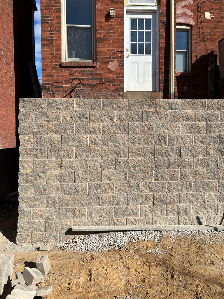 We dug those footings out and backfilled with compacted 2A limestone. The compacted footing is not as complicated as a poured concrete footing- there’s no rebar, concrete, etc. it’s literally a 24″ wide trench, filled 6″ deep with gravel and rock dust. Still we are checking all the boxes, though, so we waited for the inspection. The inspection passed on Monday morning (26 Feb) and we have been pressing forward. As soon as that passed, the guys got to setting block again and managed to bang out most of the wall along the front of the driveway in a single day. - Macro level, the schedule remains the same. I expect the entire project to take a couple of months, assuming we get decent weather. We are tracking well to my previous prediction of setting the walls by the end of February. I’m confident that we will meet that target. At that point, we’ll dump some 2B (limestone gravel) on the driveway and wait for warmer weather before we try to pour the concrete.