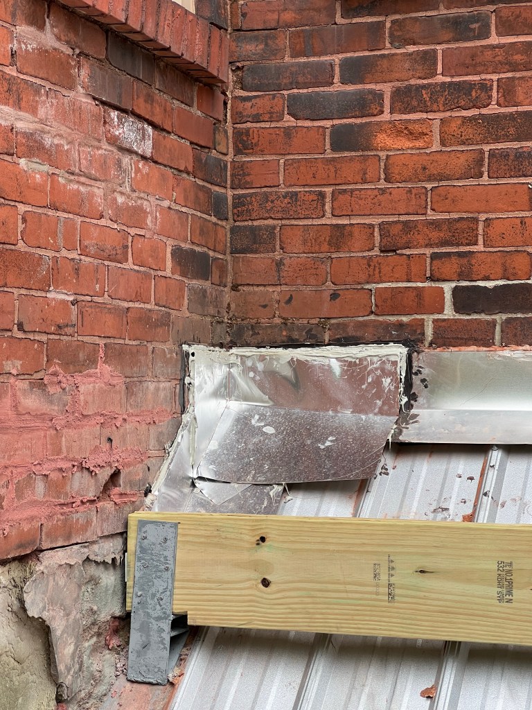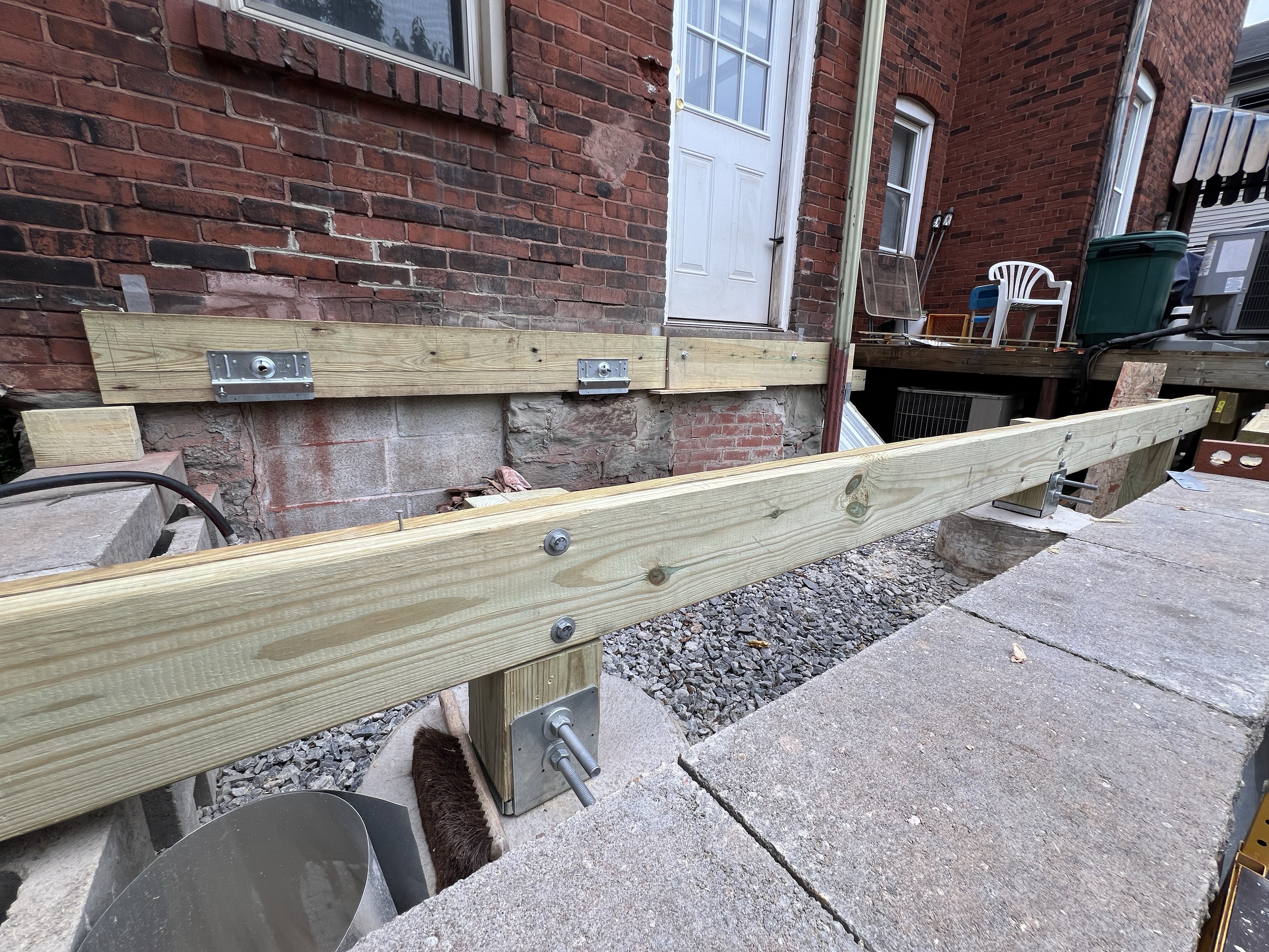 - I have finally been able to resume work on the neighbor’s deck. We had a minor difference of opinion with the structural engineer about how to handle the bilco doors, and he actually wanted me to do a bunch of additional work (cutting into the sandstone foundation, etc.). Fortunately, I have a crackerjack architect on speed dial. He was able to come take a look at the situation, and quickly agreed that my approach was more than adequate. So, I fabricated some brackets and we’re off to the races. (I never thought that knowing how to weld would be such a useful skill!). This past week, I repaired the crappy flashing job over the bilco doors, and got to work installing the posts and main beam, as well as the ledger on the building. The ledger is kind of interesting because the exterior is brick veneer, so they won’t let us just hang the ledger on the brick. We ended up using a Simpson BVLZ bracket, which attaches the ledger to the rim joist behind the brick veneer. (Here’s a link describing the brackets). Hanging the brackets involves drilling 3 holes through the brick, 1-1/8” each. Aside from turning the wall into Swiss cheese, some of the brick crumbled out, so I also got to set a few replacement bricks in the process. It’s not beautiful, but it’s behind a ledger and no one will ever critique that work.