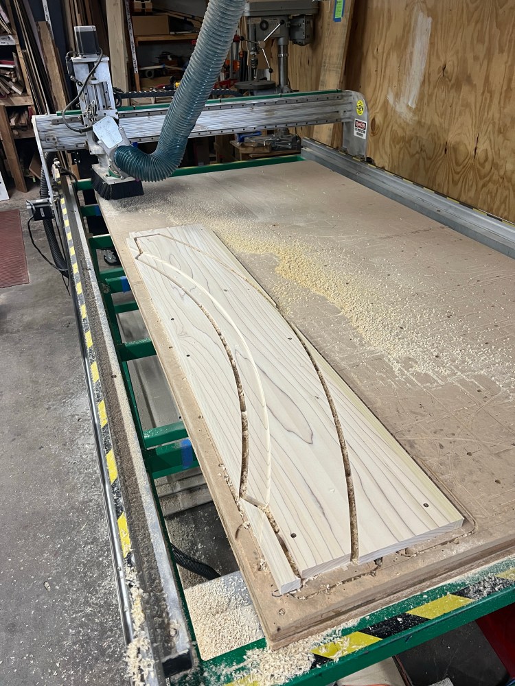 - On the inside (the vestibule) I was hoping to get the trim made to also trim that out. I’m teaching myself Fusion 360 (a CAD program), so that took a fair bit of effort. I was able to mill up a couple of pieces I’ll need, but I didn’t have all of the pieces to get it installed before the event. Needless to say, the guests all commented “gee, great house if you’d only trimmed the front door” 😉 Seriously, it is something I’ve wanted to do for a while, and I’m slowly coming up the learning curve for both the CAD software and running the CNC itself. I expect it to be valuable over the long haul, though, so it’s worth putting the time in.