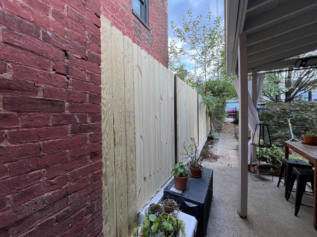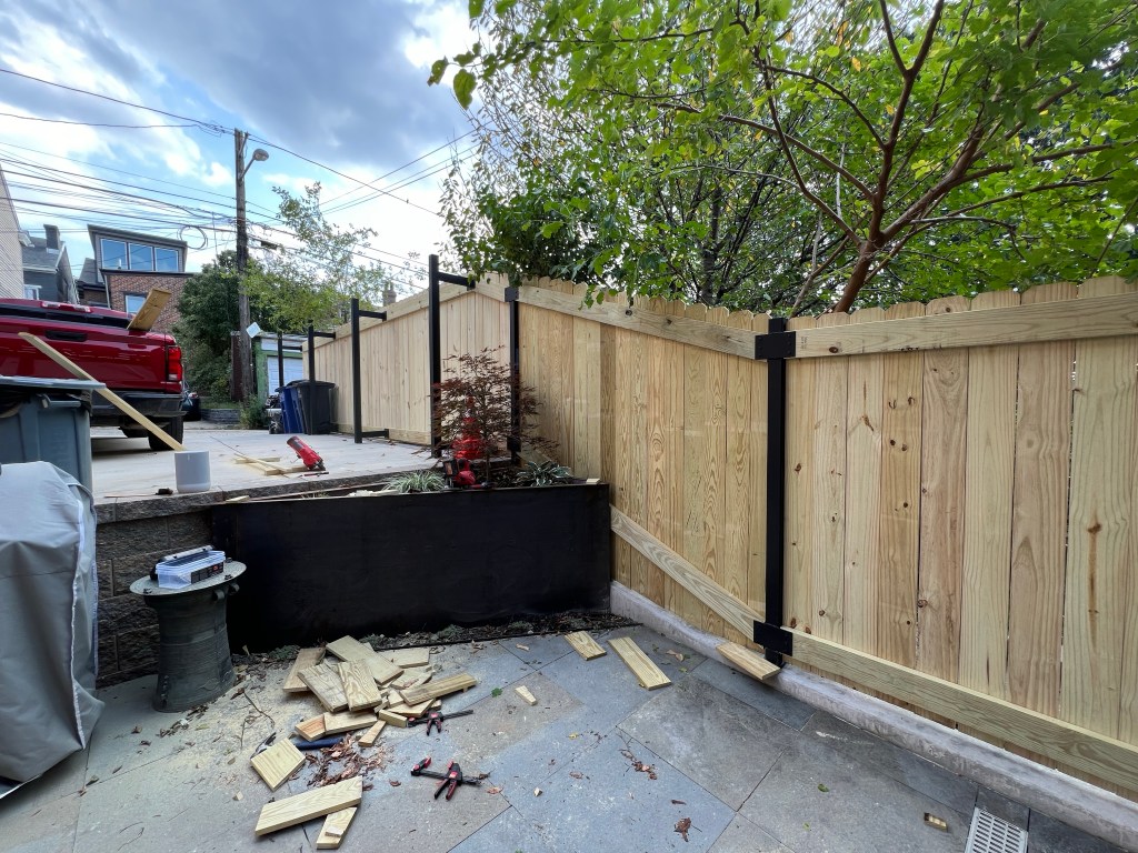 - The fence is now complete. We went with a two-rail system (instead of the usual three) so we will have to see how well this wood holds up. Although installed it with every board butted to the next, they’ve already dried enough to create ~1/8″ gaps. As long as they dry mostly straight, I’m OK with that. It does create a nice sense of privacy in the yard, while also creating a place to stash things like the trash cans.