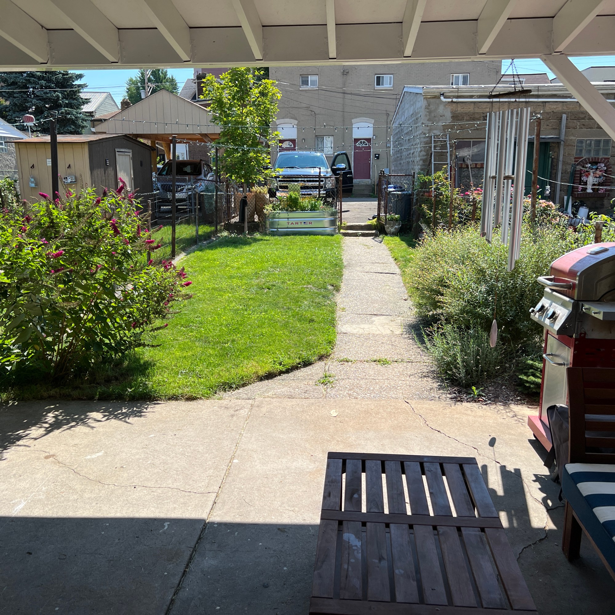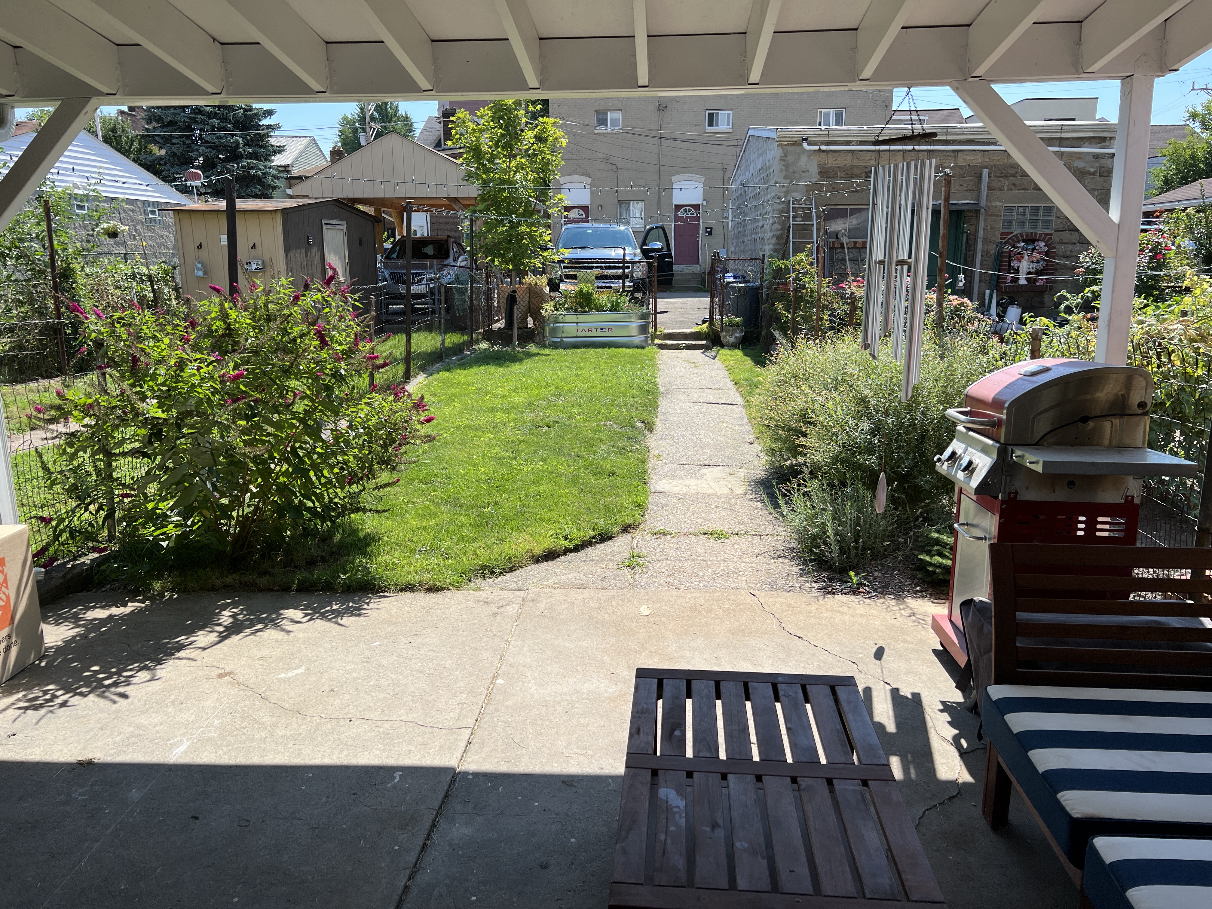 The private back yard is spectacular for entertaining. It has a covered porch (with a grill and bike storage). Plenty of space for outdoor furniture and a dining area. Low maintenance plants and a lovely fenced yard.
